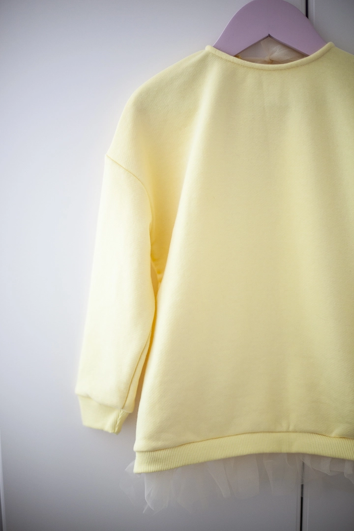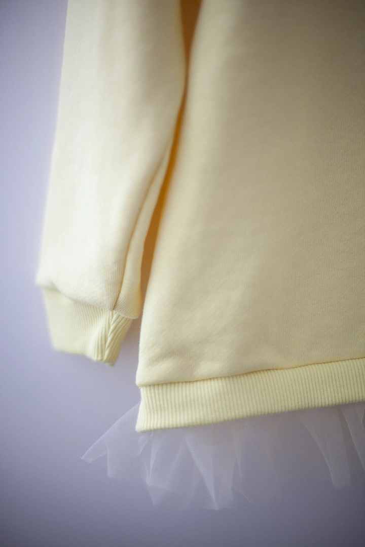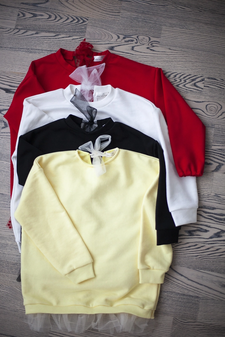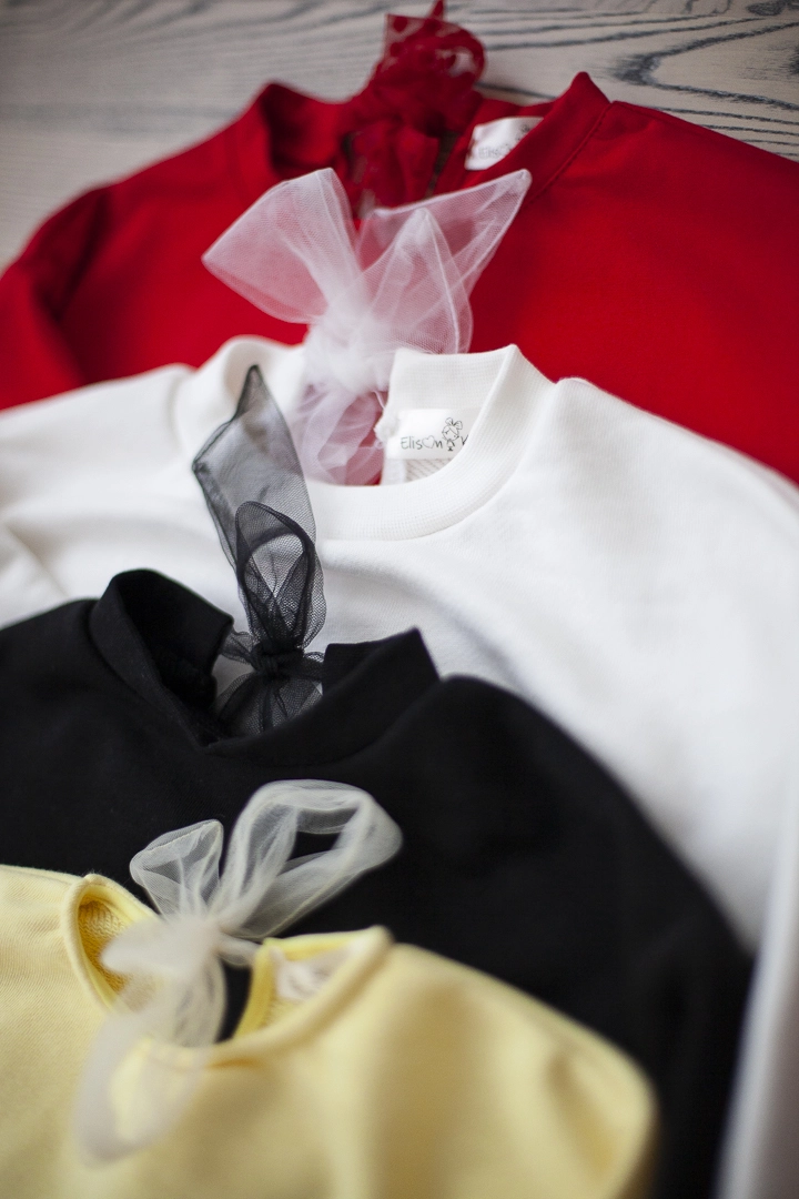 Нарядный свитшот для девочки,выполнен из полированной трехнитки, на шее завязывается на красивый бантик из мягкой сеточки, внизу кофточки красивая сборочка из сеточки в цвет изделия.